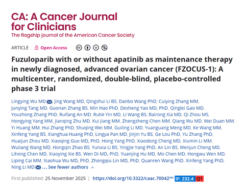 [1]Wu L, Wang J, Li Q, et al. Fuzuloparib with or without apatinib as maintenance therapy in newly diagnosed, advanced ovarian cancer (FZOCUS-1): A multicenter, randomized, double-blind, placebo-controlled phase 3 trial. CA Cancer J Clin. 2026;76(1):e70042. doi:10.3322/caac.70042